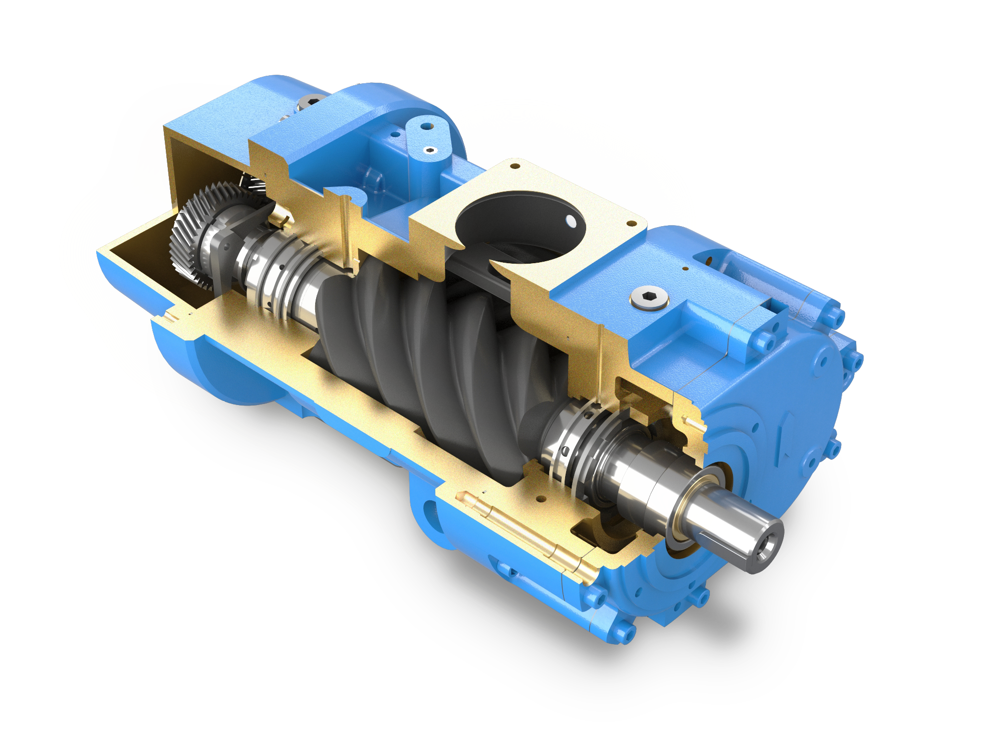 永不磨損:SWV系列的主副螺桿轉子以一對精度為AGMA14級的同步齒輪傳動,并以RO水的注入完成轉子間的密封;轉子之間不接觸,無摩擦,永不磨損,效率不會隨著時間的推移而下降。
